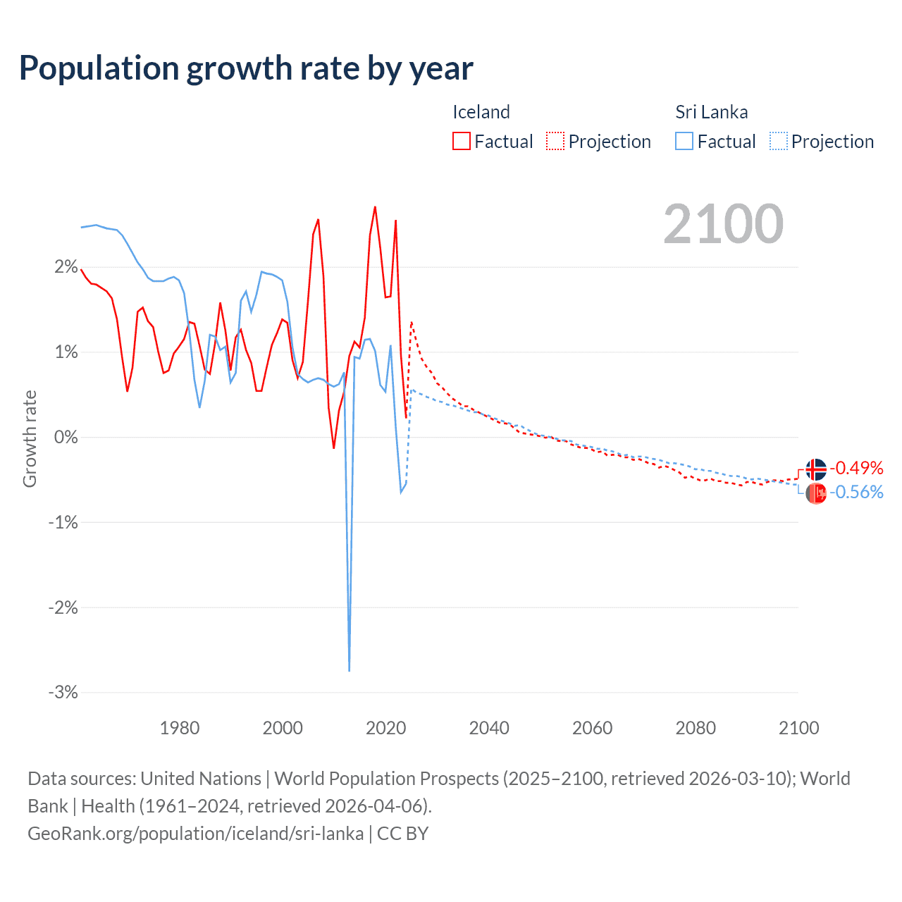 - For the last 10 years, Iceland has had an average growth rate of +1.63% per year vs +0.57% in Sri Lanka.