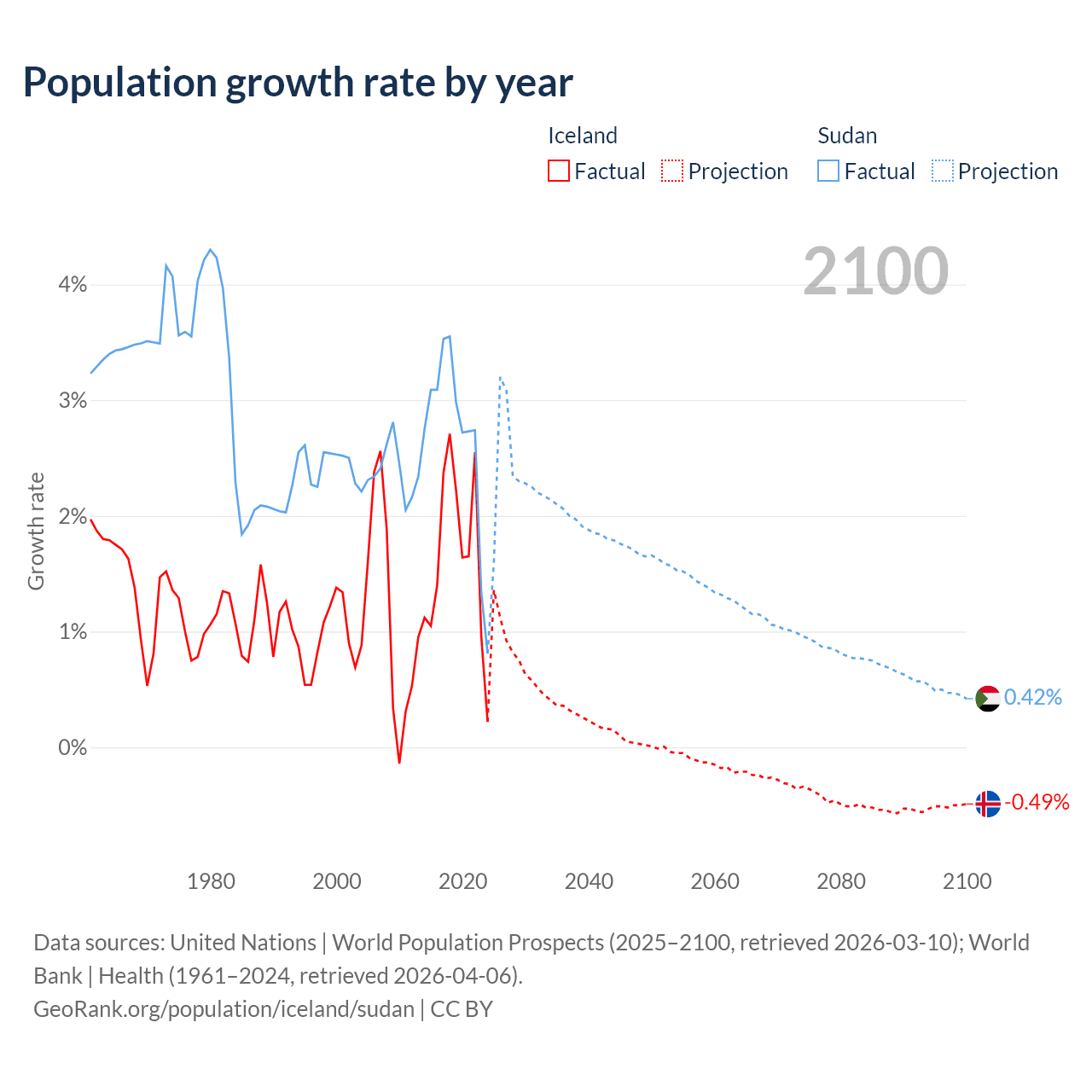 - For the last 10 years, Iceland has had an average growth rate of +1.63% per year vs +2.67% in Sudan.