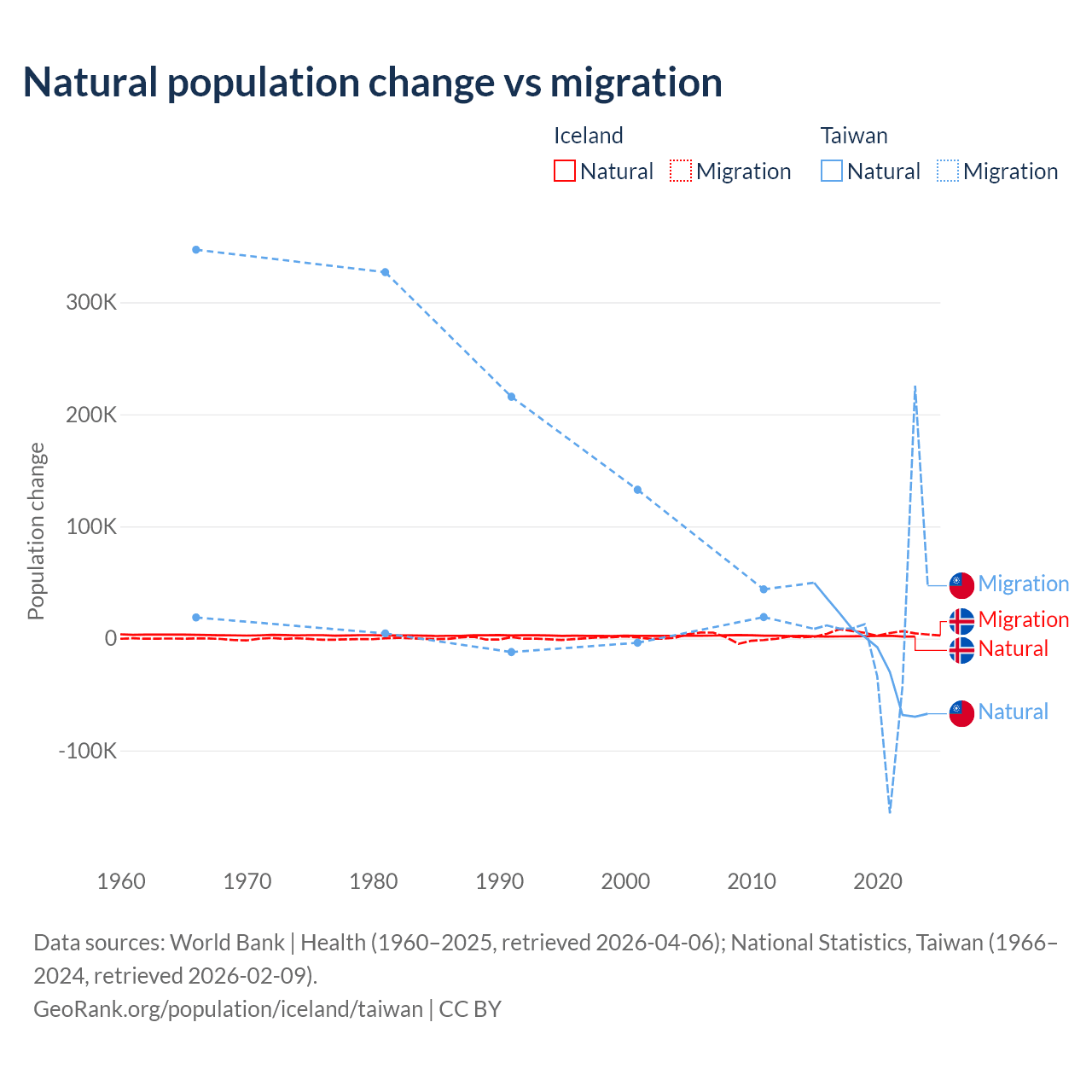 Over the last 10 years, 30.7% of the population change in Iceland is from natural causes (a gain of 20,128 people) and 69.3% is from migration (a gain of 45,356 people). In Taiwan 56.7% is from natural causes (a loss of 57,467 people) and 43.3% is from migration (a gain of 43,884 people).