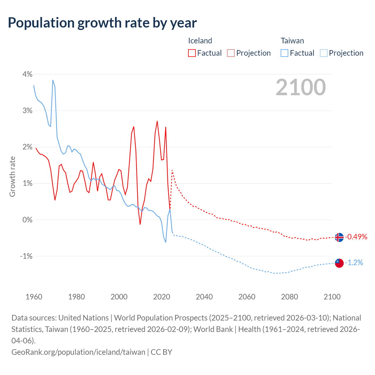 - For the last 10 years, Iceland has had an average growth rate of +1.63% per year vs -0.03% in Taiwan.