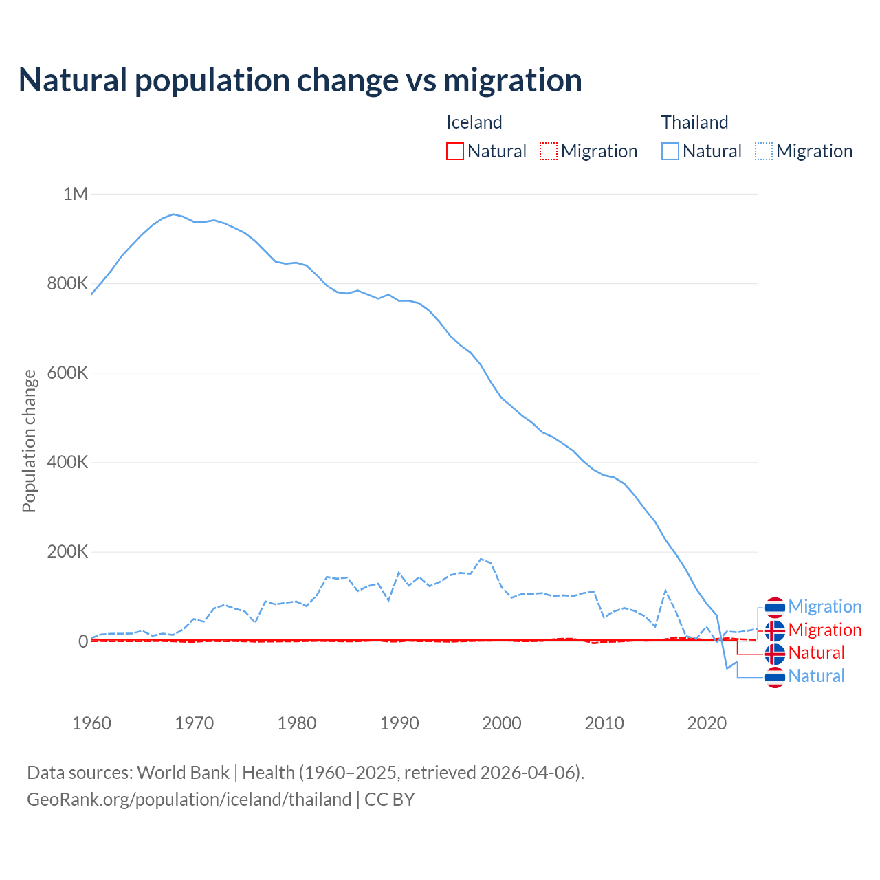 Over the last 10 years, 30.7% of the population change in Iceland is from natural causes (a gain of 20,128 people) and 69.3% is from migration (a gain of 45,356 people). In Thailand 78.4% is from natural causes (a gain of 1,292,528 people) and 21.6% is from migration (a gain of 355,361 people).