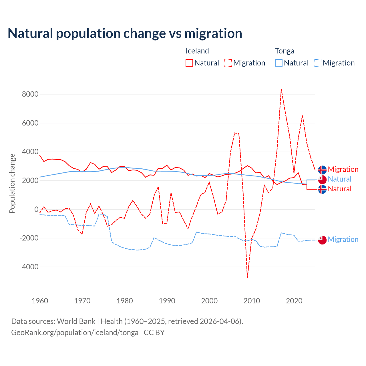 Over the last 10 years, 30.7% of the population change in Iceland is from natural causes (a gain of 20,128 people) and 69.3% is from migration (a gain of 45,356 people). In Tonga 46.9% is from natural causes (a gain of 18,919 people) and 53.1% is from migration (a loss of 21,384 people).