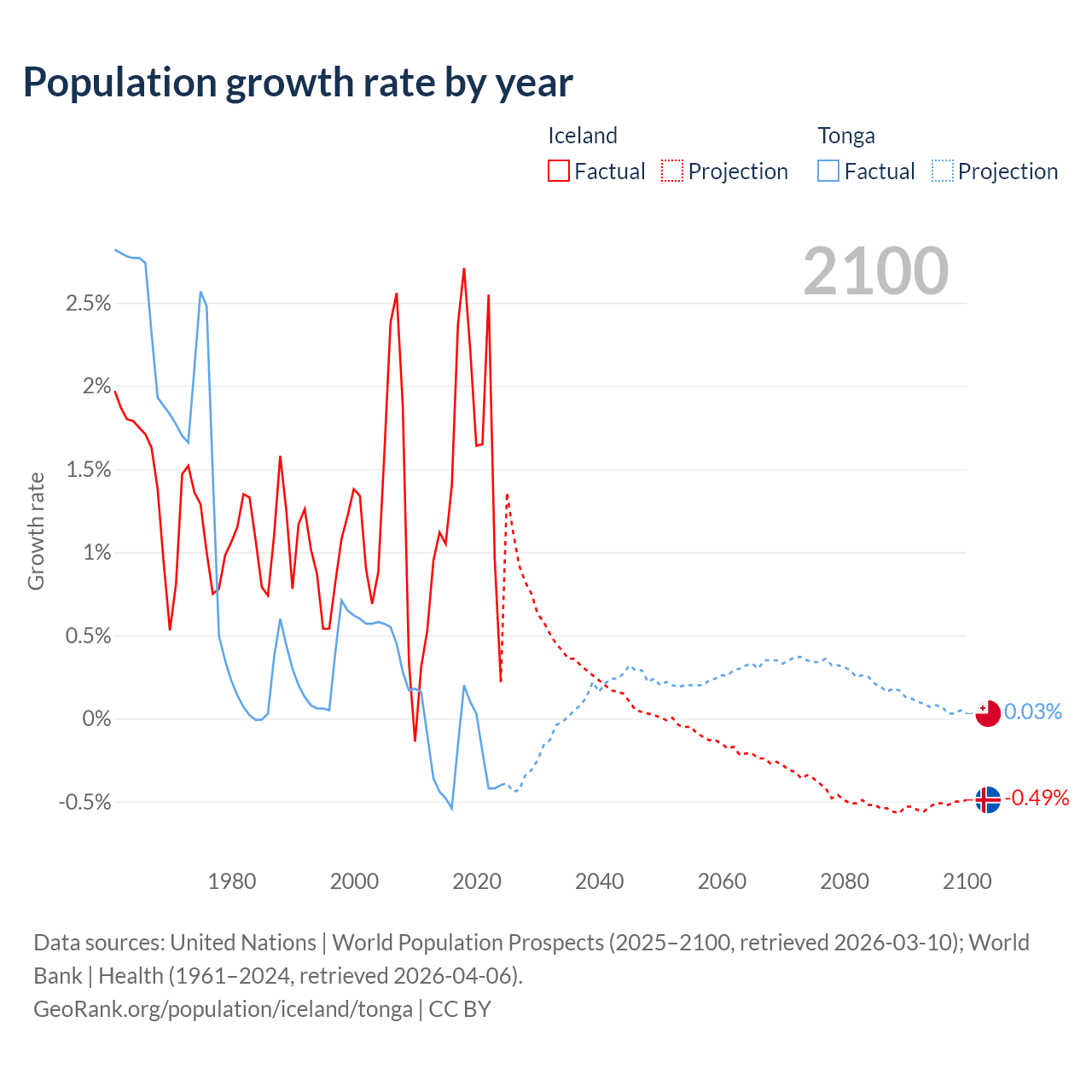 - For the last 10 years, Iceland has had an average growth rate of +1.63% per year vs -0.25% in Tonga.