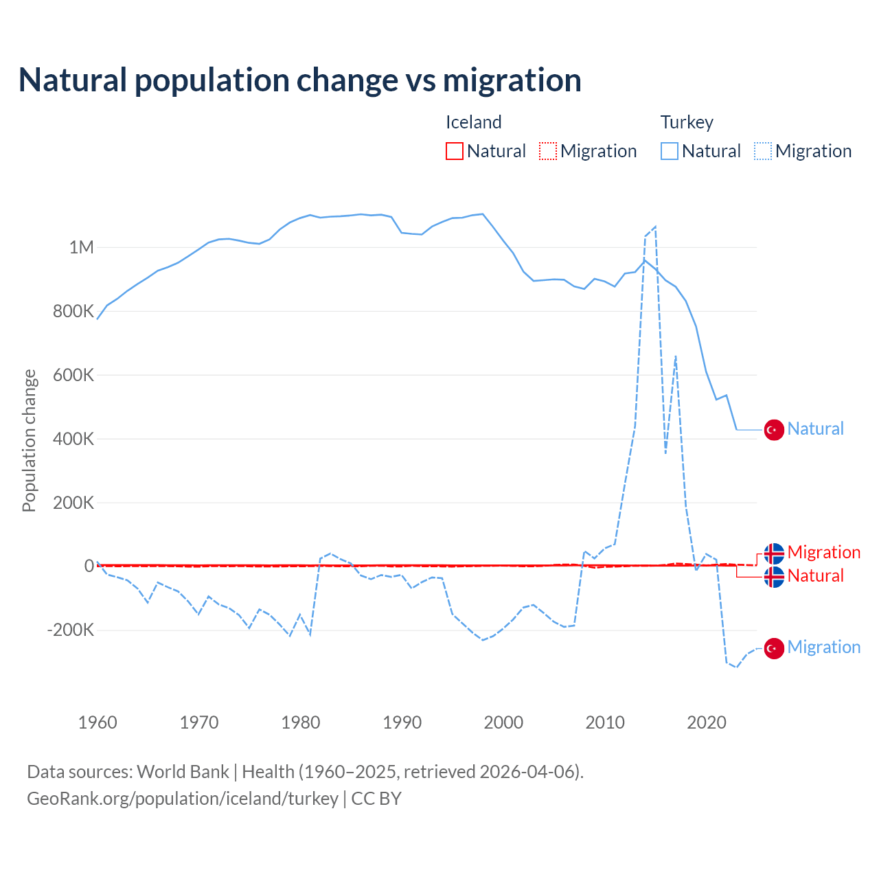 Over the last 10 years, 30.7% of the population change in Iceland is from natural causes (a gain of 20,128 people) and 69.3% is from migration (a gain of 45,356 people). In Turkey 73% is from natural causes (a gain of 7,333,352 people) and 27% is from migration (a gain of 2,718,916 people).