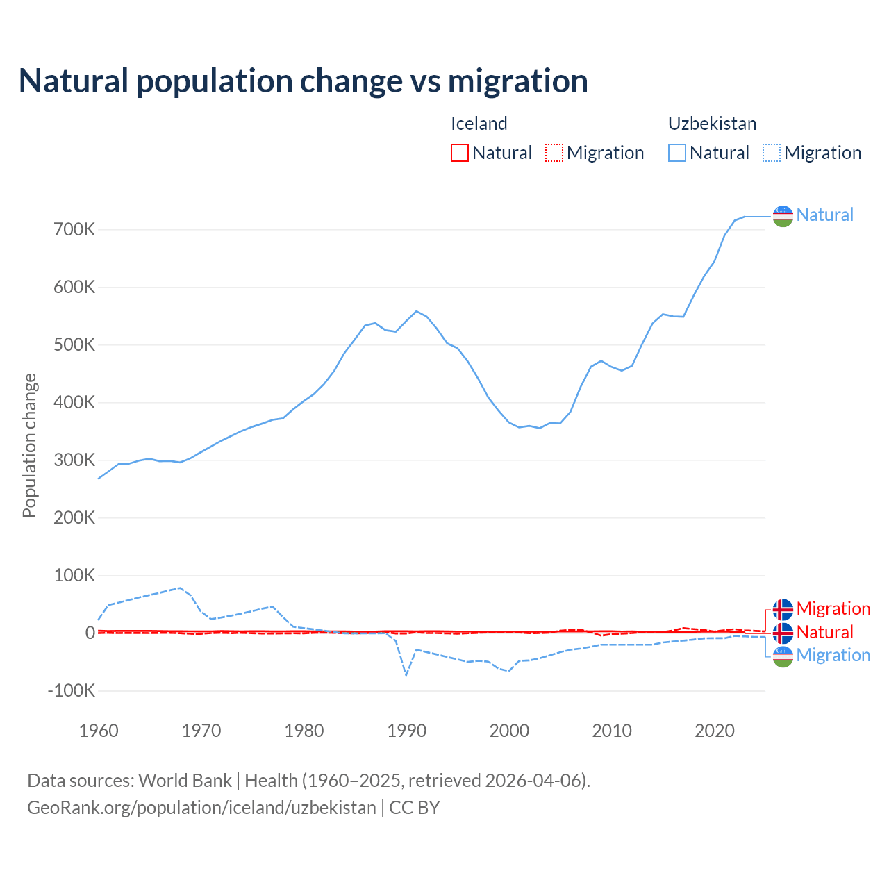 Over the last 10 years, 30.7% of the population change in Iceland is from natural causes (a gain of 20,128 people) and 69.3% is from migration (a gain of 45,356 people). In Uzbekistan 98.2% is from natural causes (a gain of 6,161,117 people) and 1.84% is from migration (a loss of 115,398 people).