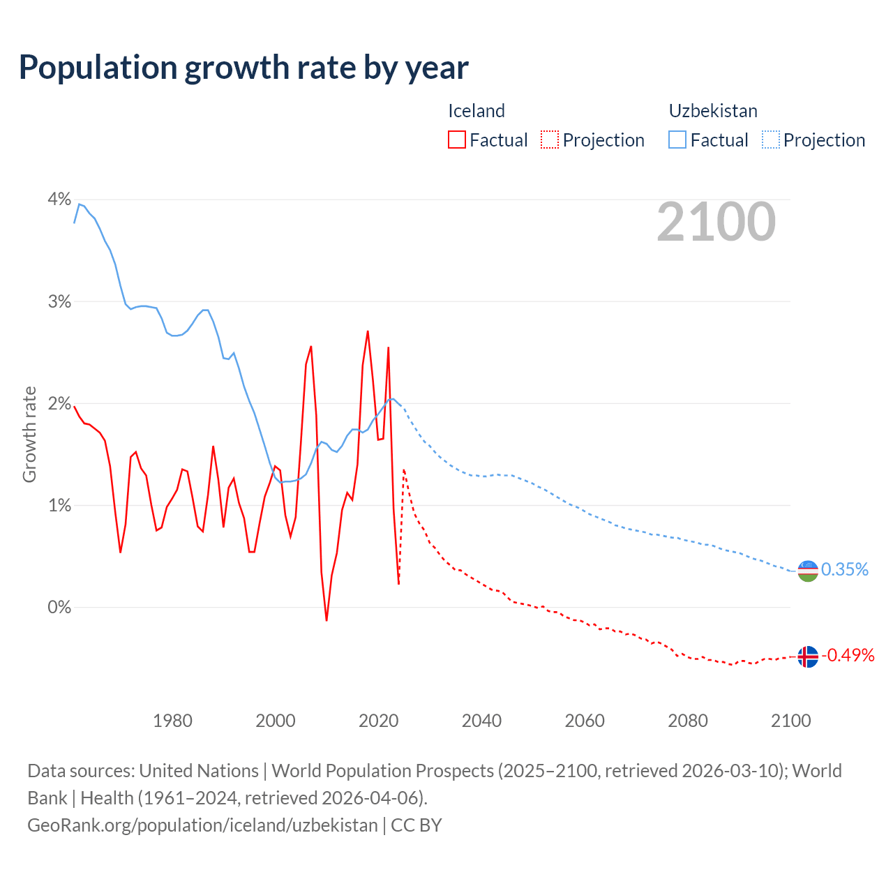 - For the last 10 years, Iceland has had an average growth rate of +1.63% per year vs +1.85% in Uzbekistan.