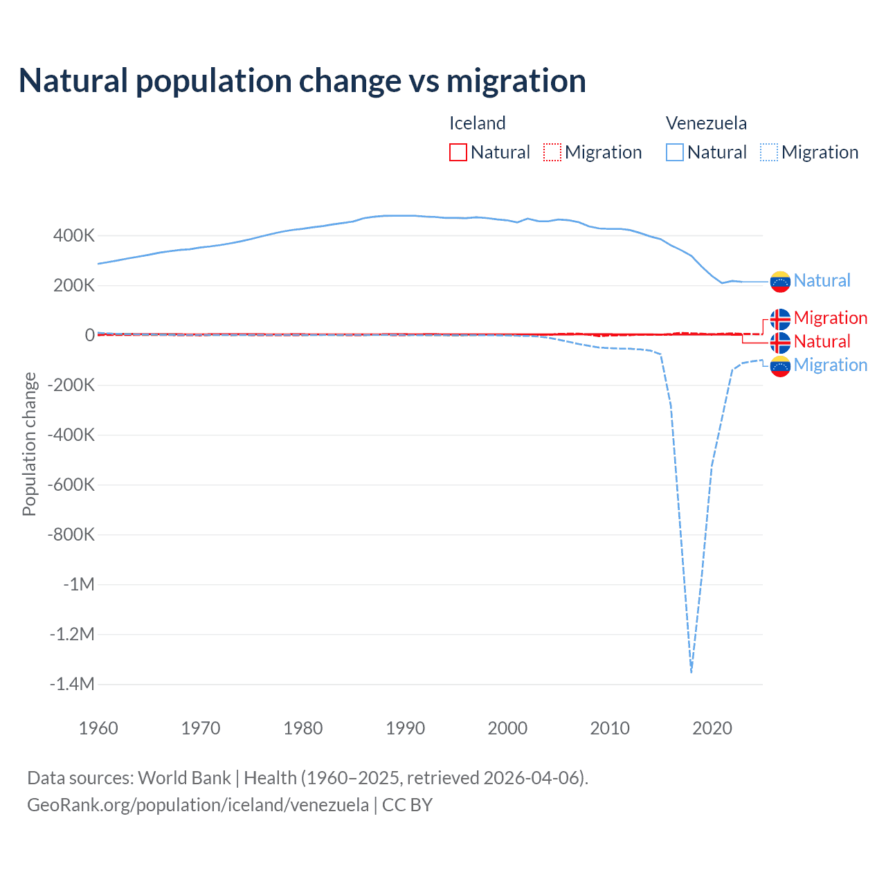 Over the last 10 years, 30.7% of the population change in Iceland is from natural causes (a gain of 20,128 people) and 69.3% is from migration (a gain of 45,356 people). In Venezuela 38.6% is from natural causes (a gain of 2,946,257 people) and 61.4% is from migration (a loss of 4,683,227 people).