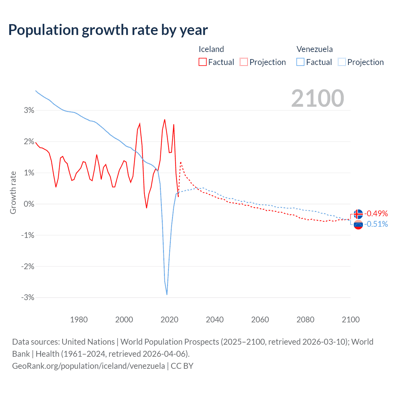 - For the last 10 years, Iceland has had an average growth rate of +1.63% per year vs -0.46% in Venezuela.
