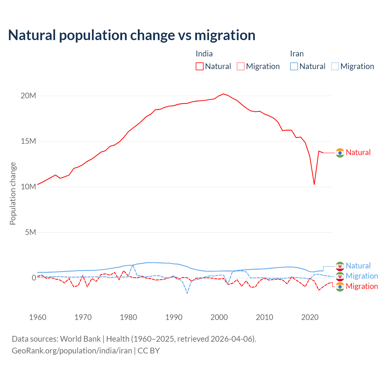 Over the last 10 years, 96.4% of the population change in India is from natural causes (a gain of 145,503,378 people) and 3.56% is from migration (a loss of 5,376,884 people). In Iran 92.5% is from natural causes (a gain of 9,405,860 people) and 7.46% is from migration (a gain of 757,979 people).