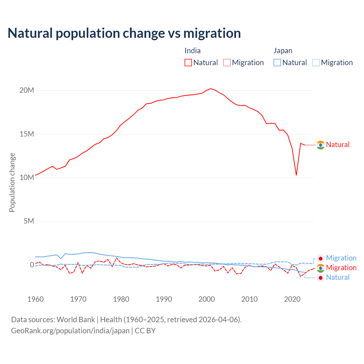 Over the last 10 years, 96.4% of the population change in India is from natural causes (a gain of 145,503,378 people) and 3.56% is from migration (a loss of 5,376,884 people). In Japan 73.6% is from natural causes (a loss of 5,178,838 people) and 26.4% is from migration (a gain of 1,860,103 people).