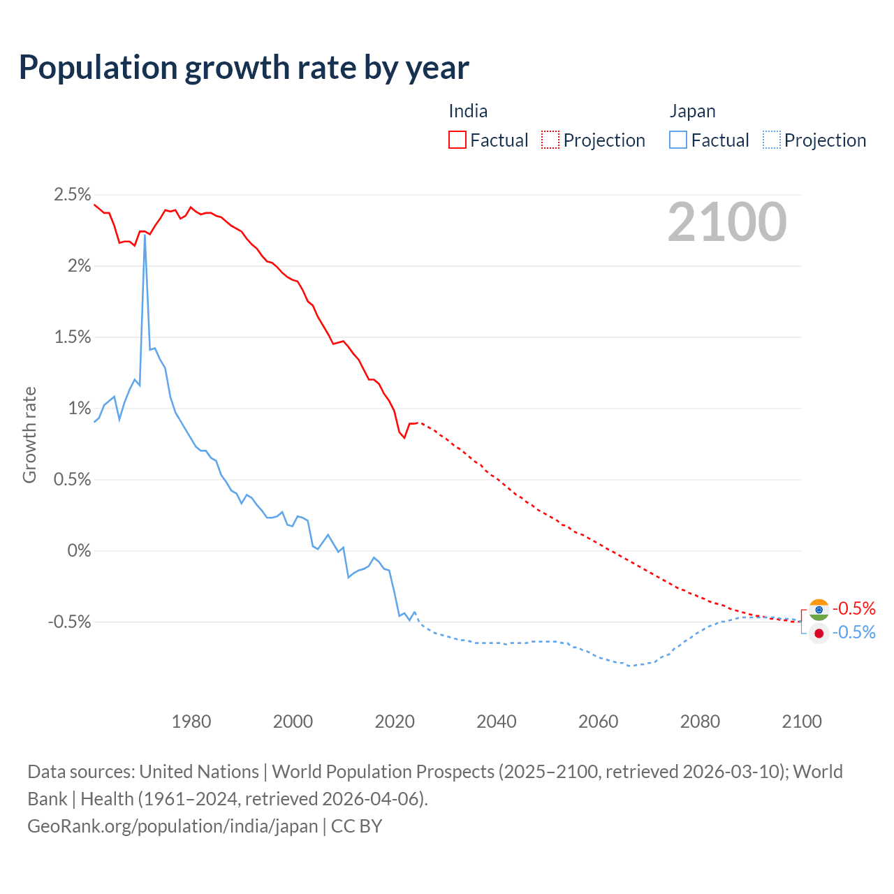 - For the last 10 years, India has had an average growth rate of +1.03% per year vs -0.25% in Japan.
