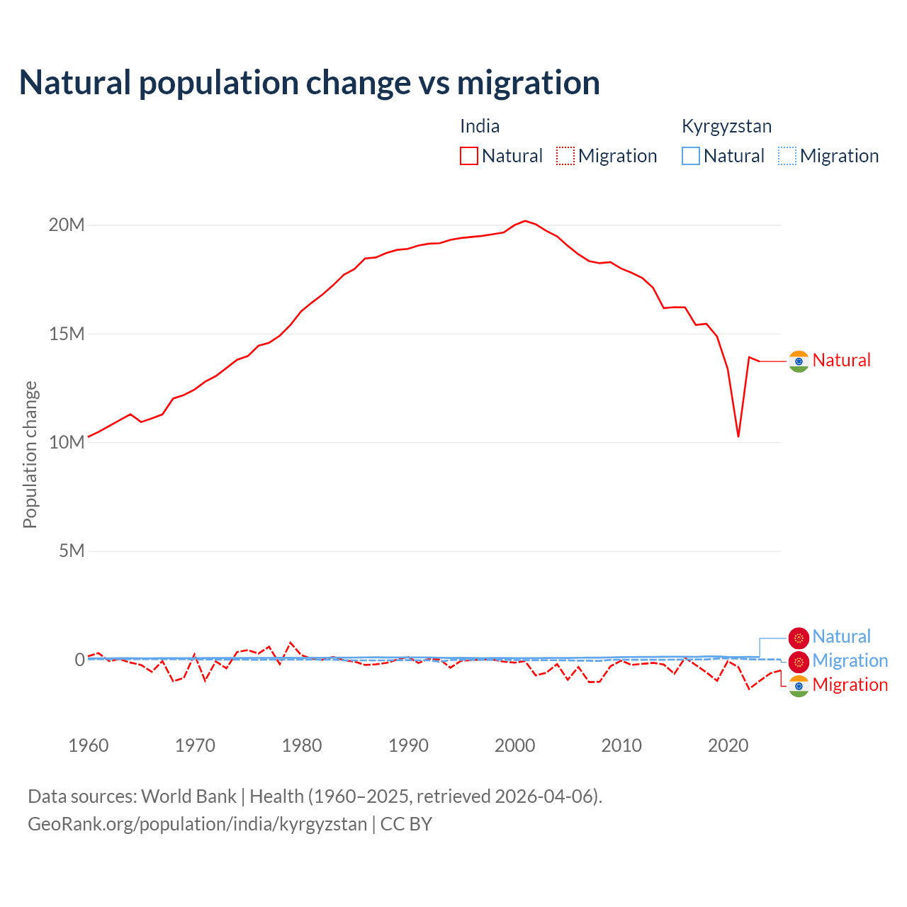 Over the last 10 years, 96.4% of the population change in India is from natural causes (a gain of 145,503,378 people) and 3.56% is from migration (a loss of 5,376,884 people). In Kyrgyzstan 88.5% is from natural causes (a gain of 1,258,837 people) and 11.5% is from migration (a gain of 164,132 people).
