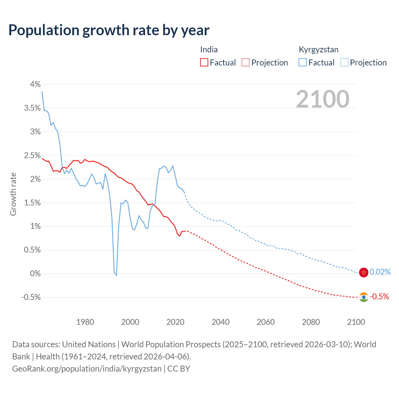 - For the last 10 years, India has had an average growth rate of +1.03% per year vs +2.05% in Kyrgyzstan.