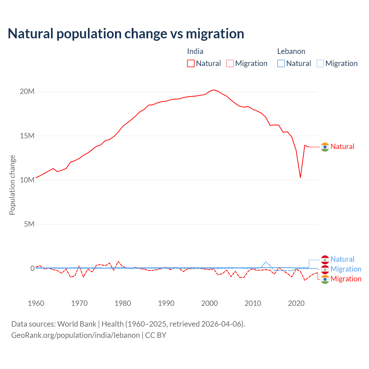 Over the last 10 years, 96.4% of the population change in India is from natural causes (a gain of 145,503,378 people) and 3.56% is from migration (a loss of 5,376,884 people). In Lebanon 40.1% is from natural causes (a gain of 739,256 people) and 59.9% is from migration (a loss of 1,103,772 people).