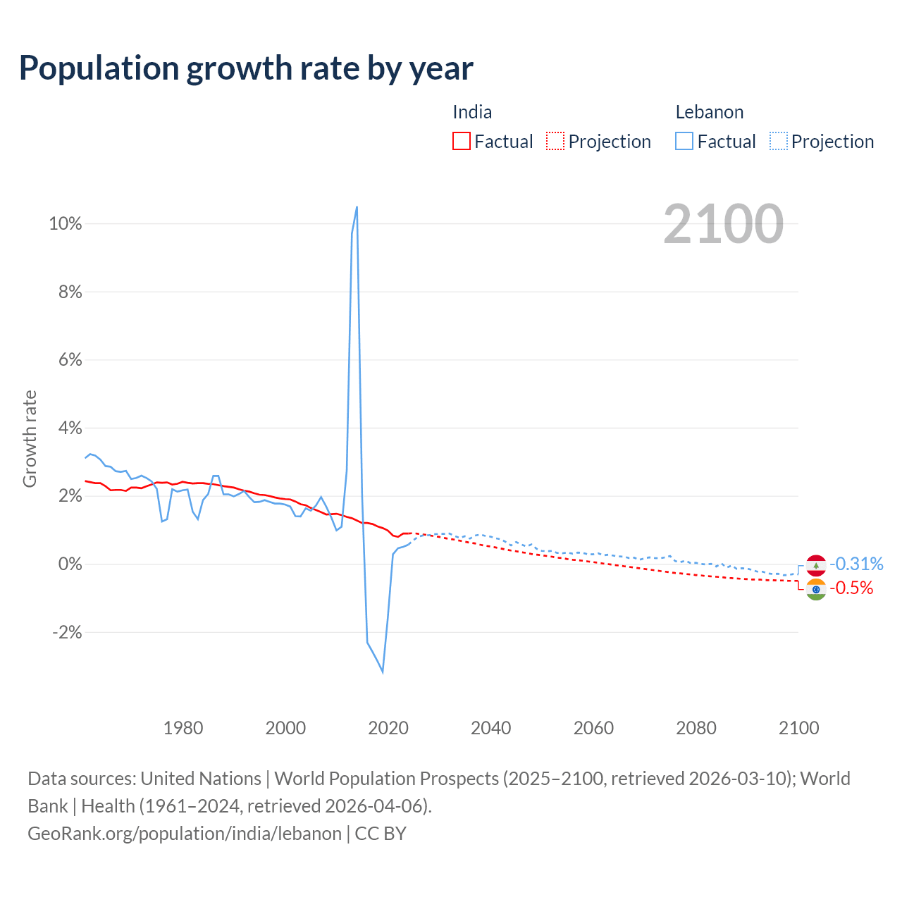 - For the last 10 years, India has had an average growth rate of +1.03% per year vs +0.16% in Lebanon.