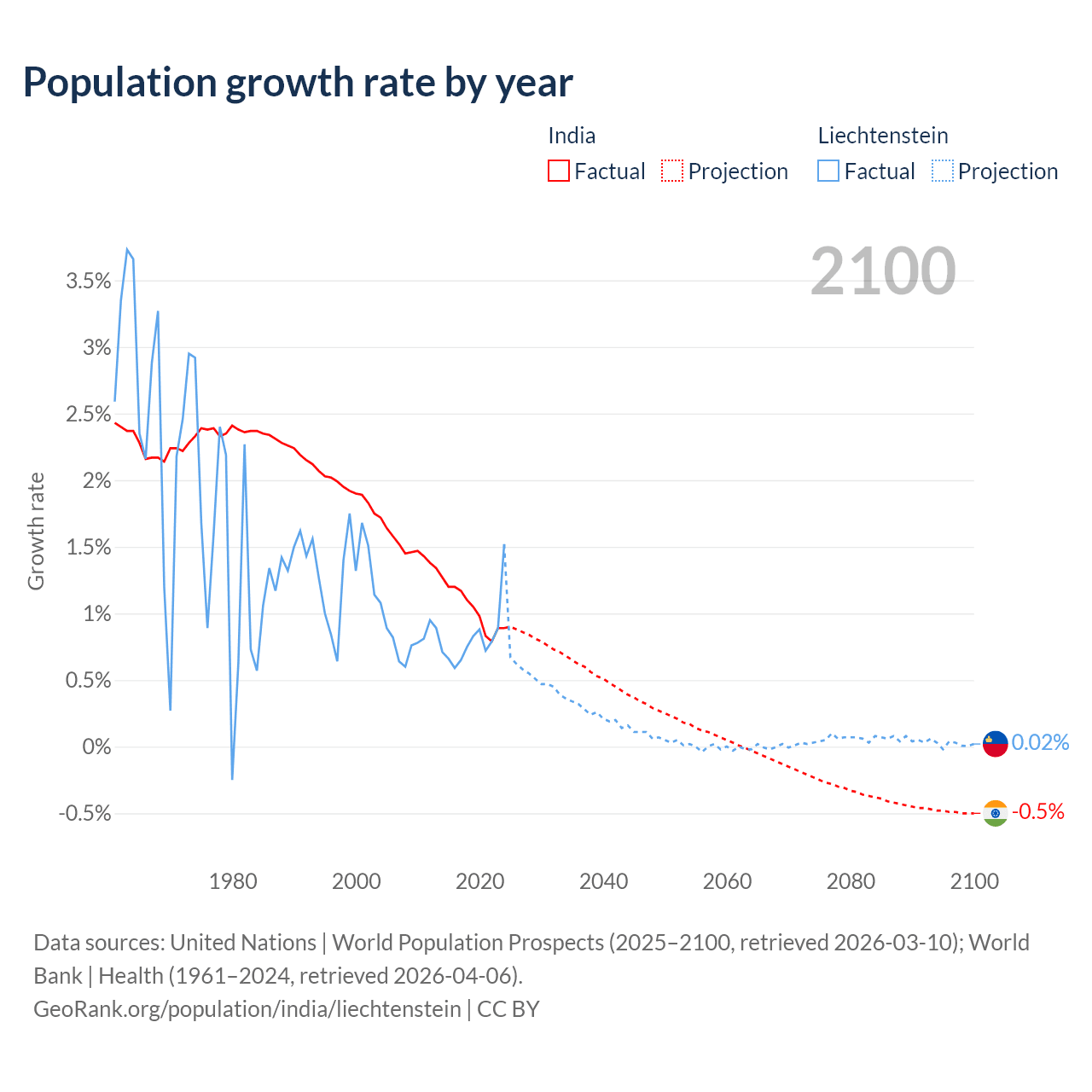 - For the last 10 years, India has had an average growth rate of +1.03% per year vs +0.82% in Liechtenstein.