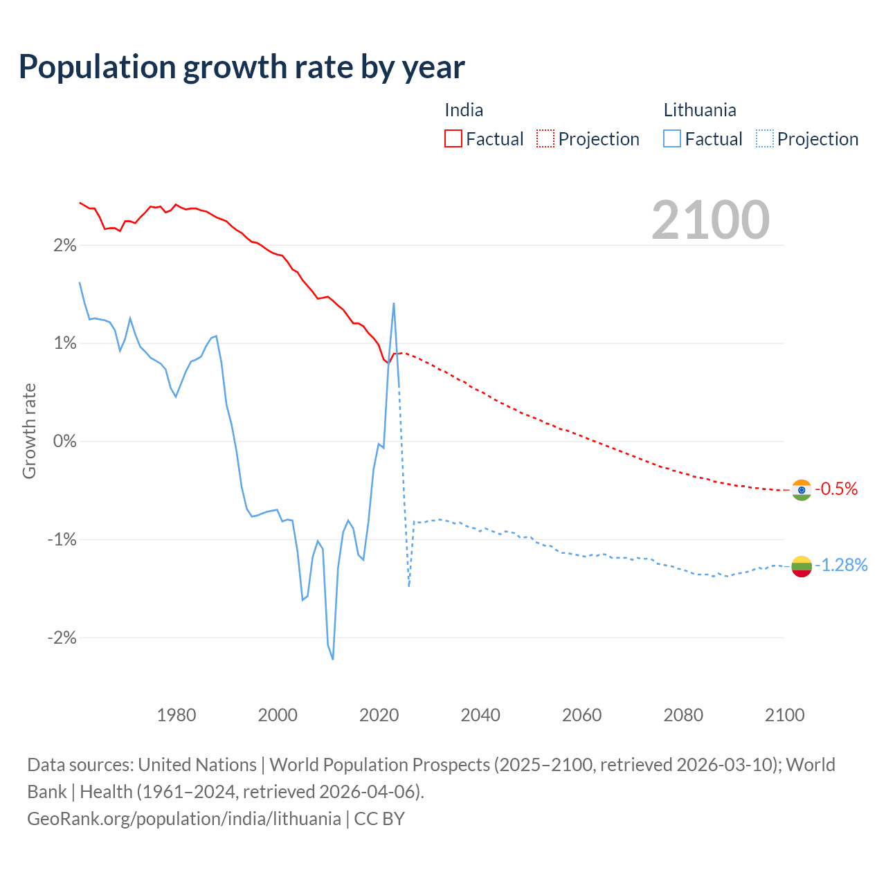 - For the last 10 years, India has had an average growth rate of +1.03% per year vs -0.22% in Lithuania.
