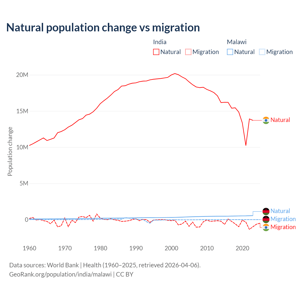 Over the last 10 years, 96.4% of the population change in India is from natural causes (a gain of 145,503,378 people) and 3.56% is from migration (a loss of 5,376,884 people). In Malawi 99.3% is from natural causes (a gain of 5,019,393 people) and 0.67% is from migration (a loss of 33,768 people).