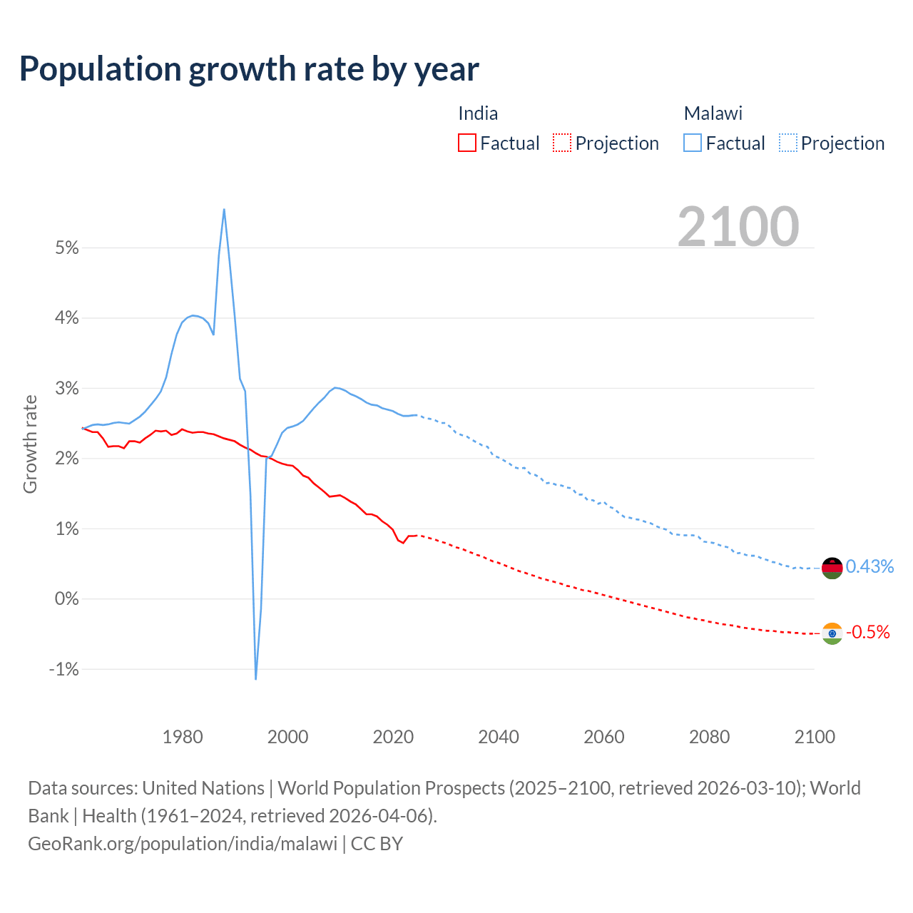 - For the last 10 years, India has had an average growth rate of +1.03% per year vs +2.7% in Malawi.