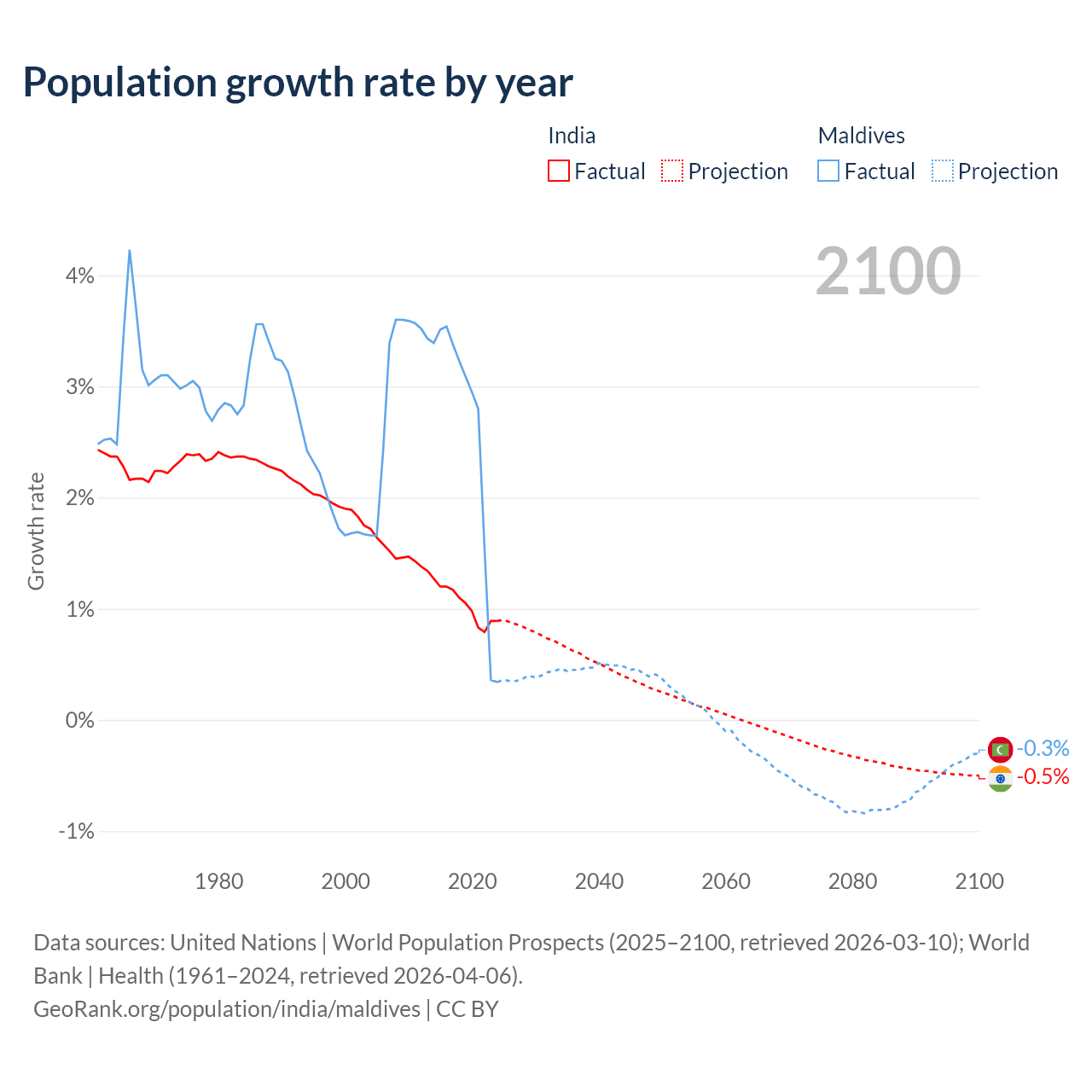 - For the last 10 years, India has had an average growth rate of +1.03% per year vs +2.56% in Maldives.