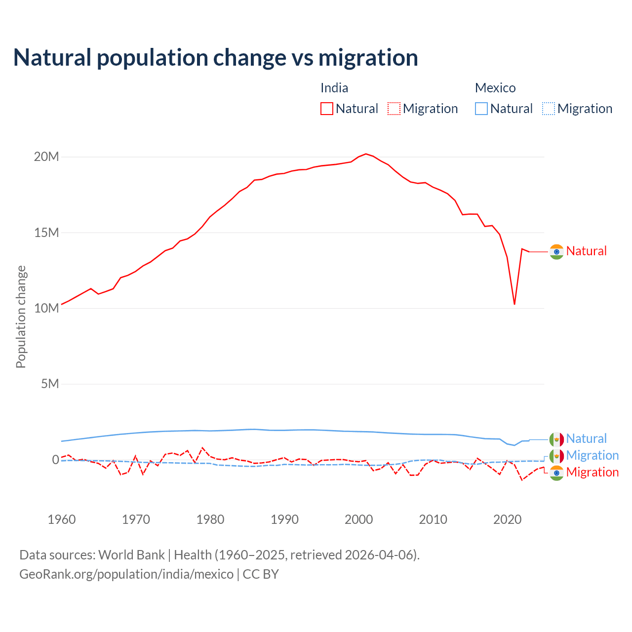 Over the last 10 years, 96.4% of the population change in India is from natural causes (a gain of 145,503,378 people) and 3.56% is from migration (a loss of 5,376,884 people). In Mexico 87.5% is from natural causes (a gain of 13,080,136 people) and 12.5% is from migration (a loss of 1,876,544 people).