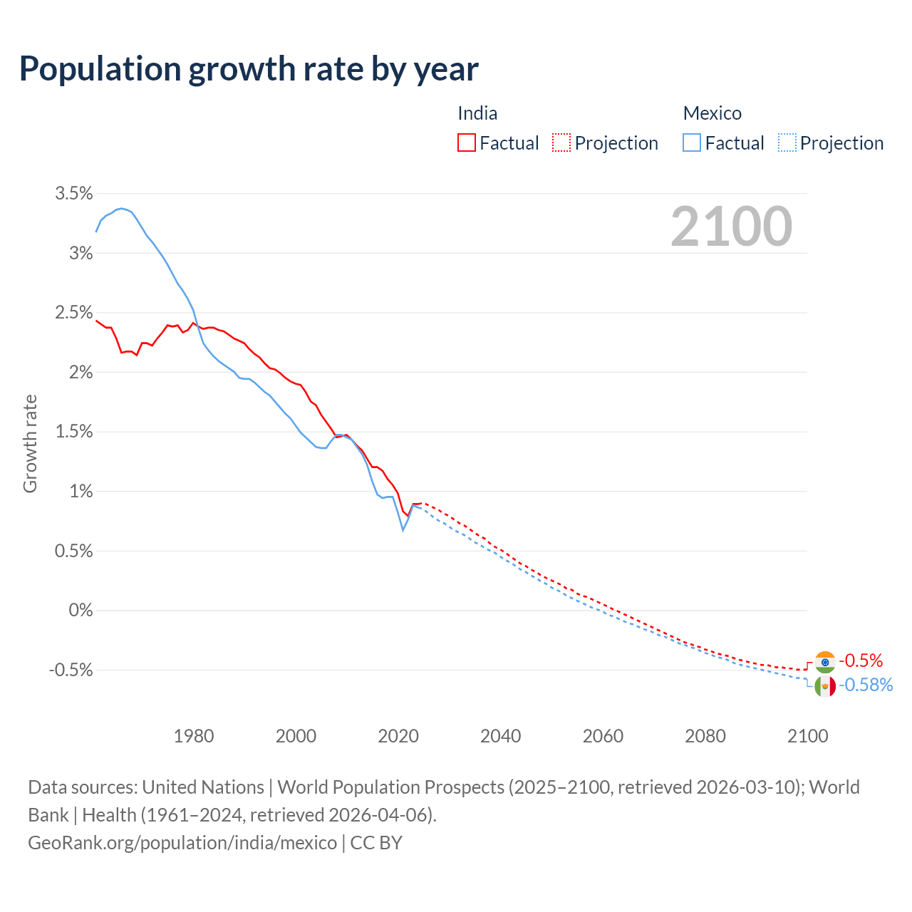 - For the last 10 years, India has had an average growth rate of +1.03% per year vs +0.92% in Mexico.