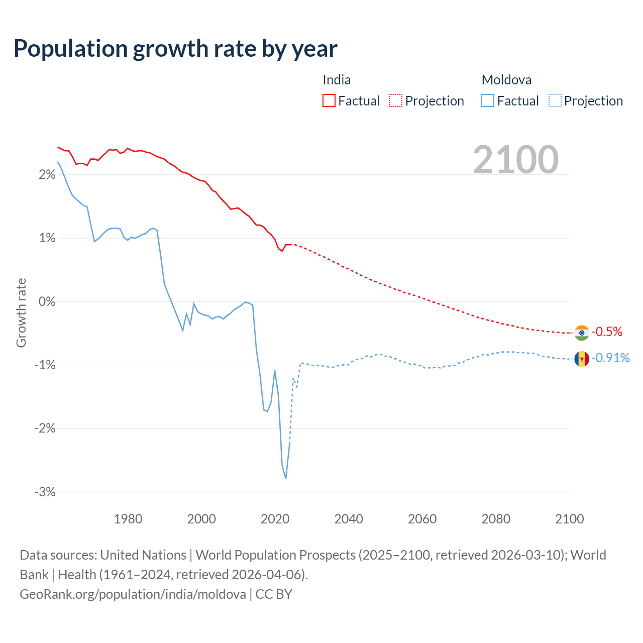 - For the last 10 years, India has had an average growth rate of +1.03% per year vs -1.57% in Moldova.