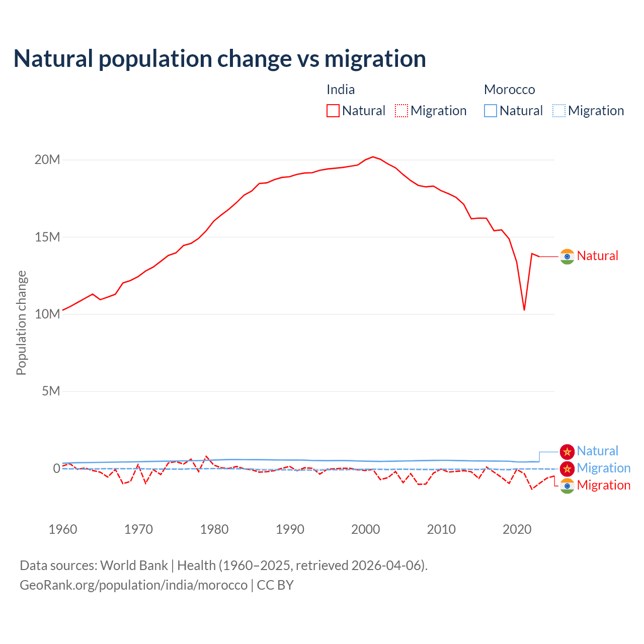 Over the last 10 years, 96.4% of the population change in India is from natural causes (a gain of 145,503,378 people) and 3.56% is from migration (a loss of 5,376,884 people). In Morocco 88.3% is from natural causes (a gain of 4,495,223 people) and 11.7% is from migration (a loss of 594,083 people).