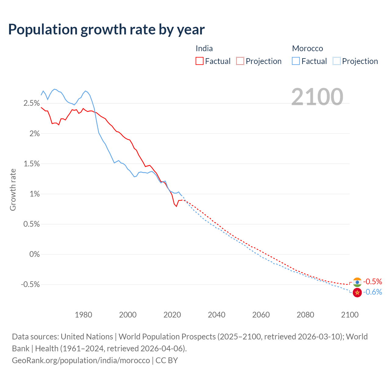 - For the last 10 years, India has had an average growth rate of +1.03% per year vs +1.09% in Morocco.