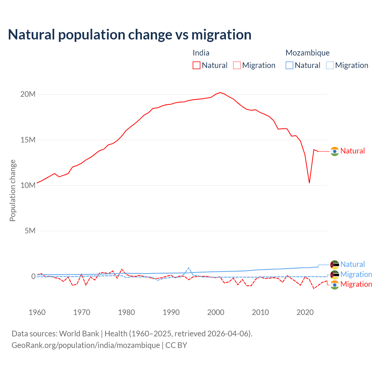 Over the last 10 years, 96.4% of the population change in India is from natural causes (a gain of 145,503,378 people) and 3.56% is from migration (a loss of 5,376,884 people). In Mozambique 95.9% is from natural causes (a gain of 9,108,203 people) and 4.15% is from migration (a loss of 393,923 people).