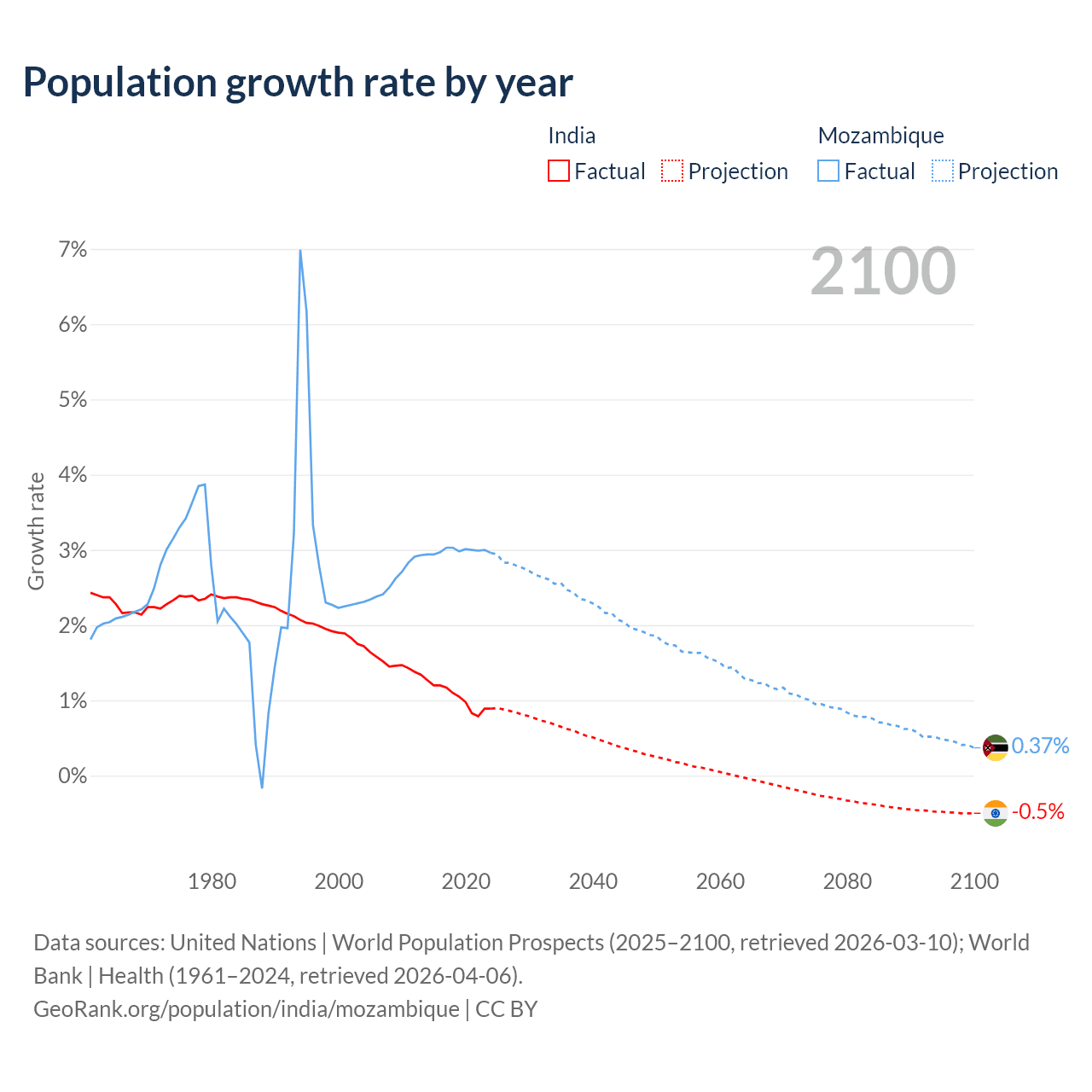 - For the last 10 years, India has had an average growth rate of +1.03% per year vs +2.99% in Mozambique.
