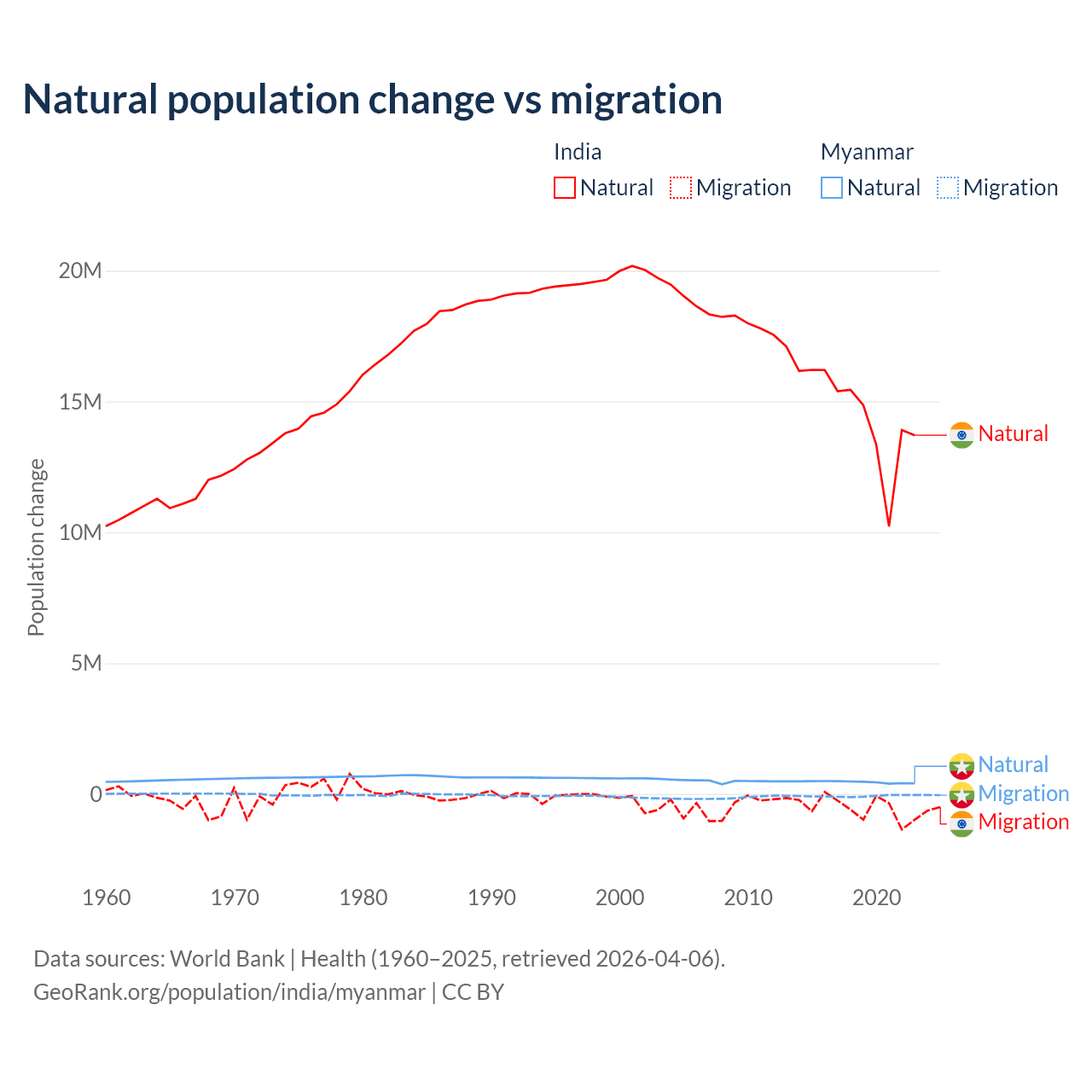 Over the last 10 years, 96.4% of the population change in India is from natural causes (a gain of 145,503,378 people) and 3.56% is from migration (a loss of 5,376,884 people). In Myanmar 86% is from natural causes (a gain of 4,594,615 people) and 14% is from migration (a loss of 749,272 people).