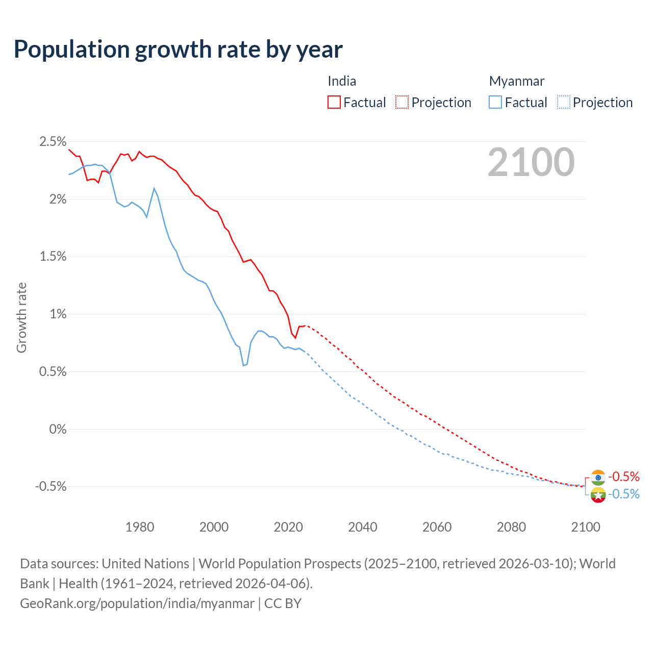 - For the last 10 years, India has had an average growth rate of +1.03% per year vs +0.74% in Myanmar.