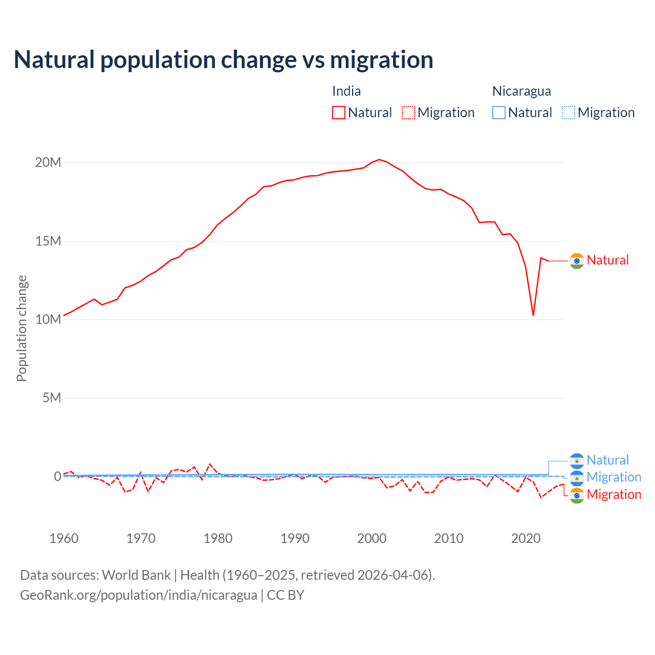 Over the last 10 years, 96.4% of the population change in India is from natural causes (a gain of 145,503,378 people) and 3.56% is from migration (a loss of 5,376,884 people). In Nicaragua 85.5% is from natural causes (a gain of 1,017,084 people) and 14.5% is from migration (a loss of 172,078 people).