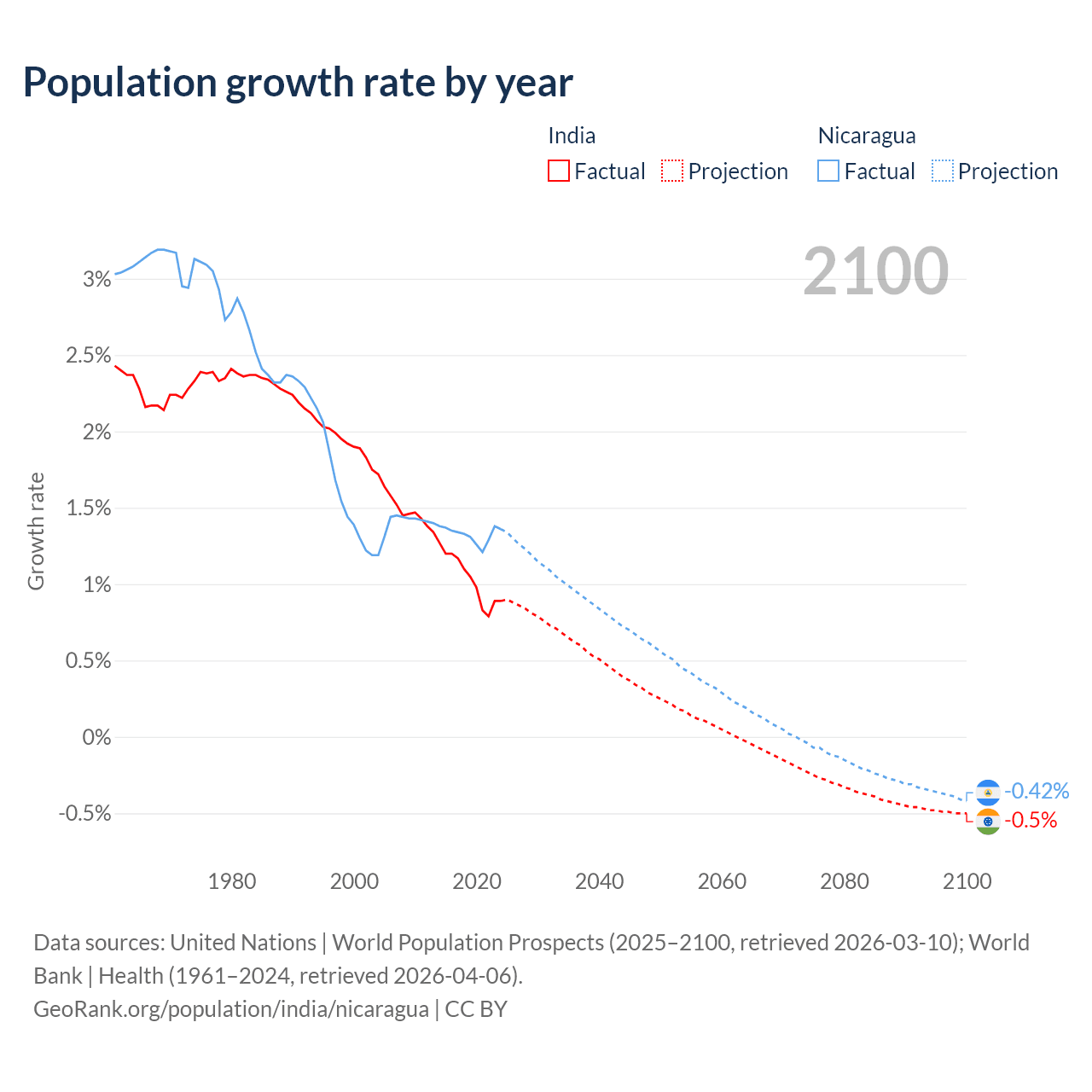 - For the last 10 years, India has had an average growth rate of +1.03% per year vs +1.33% in Nicaragua.