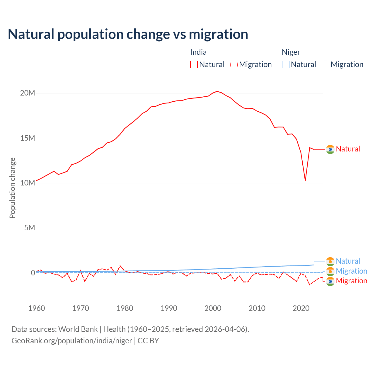 Over the last 10 years, 96.4% of the population change in India is from natural causes (a gain of 145,503,378 people) and 3.56% is from migration (a loss of 5,376,884 people). In Niger 100% is from natural causes (a gain of 7,728,287 people) and 0.03% is from migration (a gain of 2,520 people).