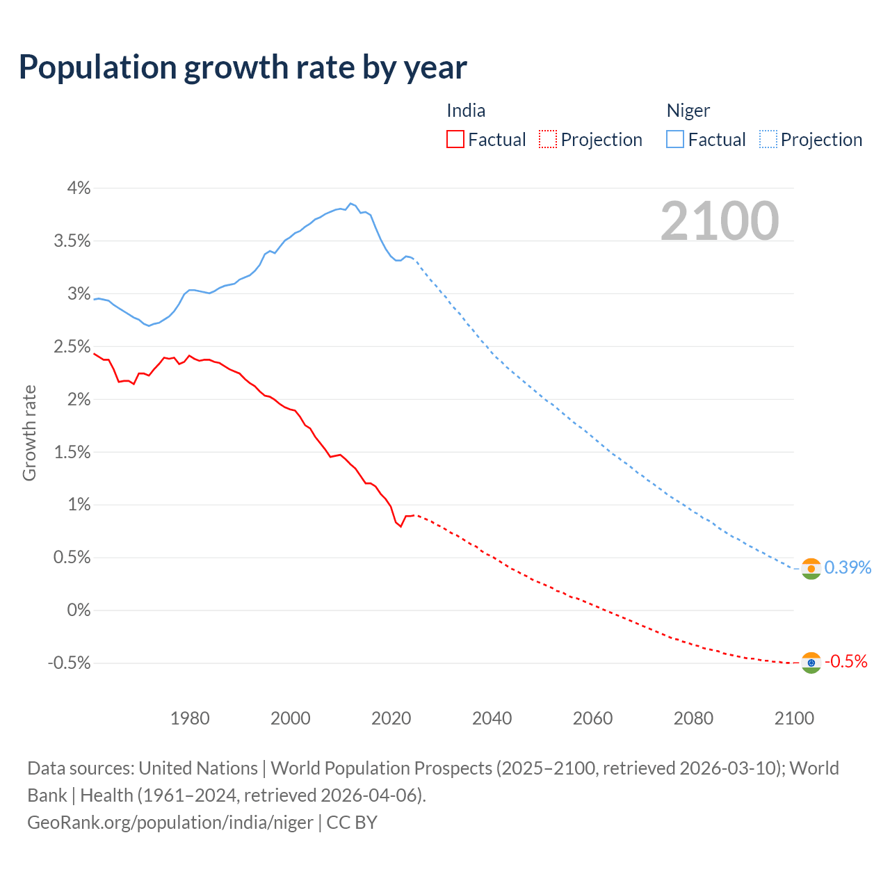- For the last 10 years, India has had an average growth rate of +1.03% per year vs +3.5% in Niger.