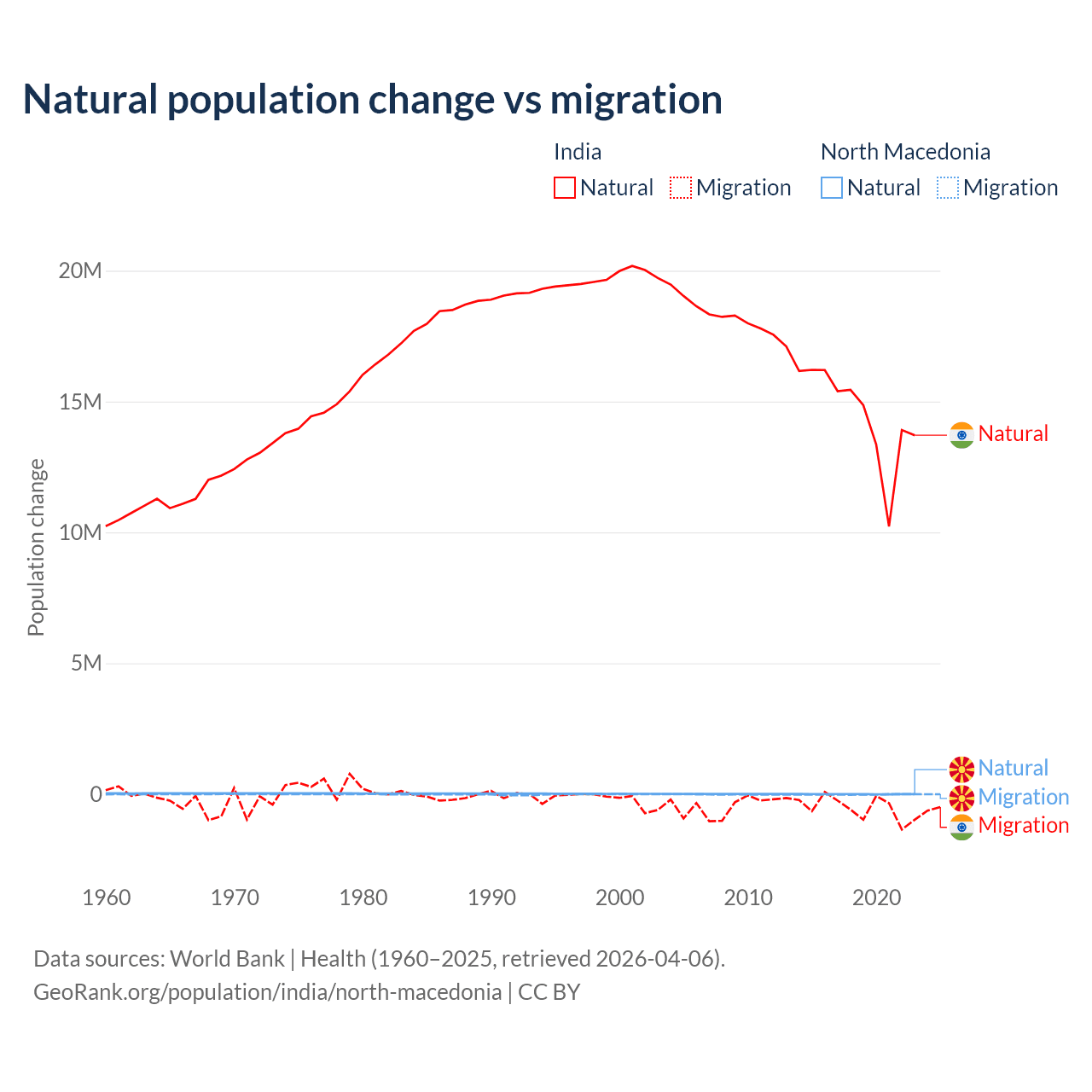 Over the last 10 years, 96.4% of the population change in India is from natural causes (a gain of 145,503,378 people) and 3.56% is from migration (a loss of 5,376,884 people). In North Macedonia 6.45% is from natural causes (a loss of 12,585 people) and 93.5% is from migration (a loss of 182,429 people).