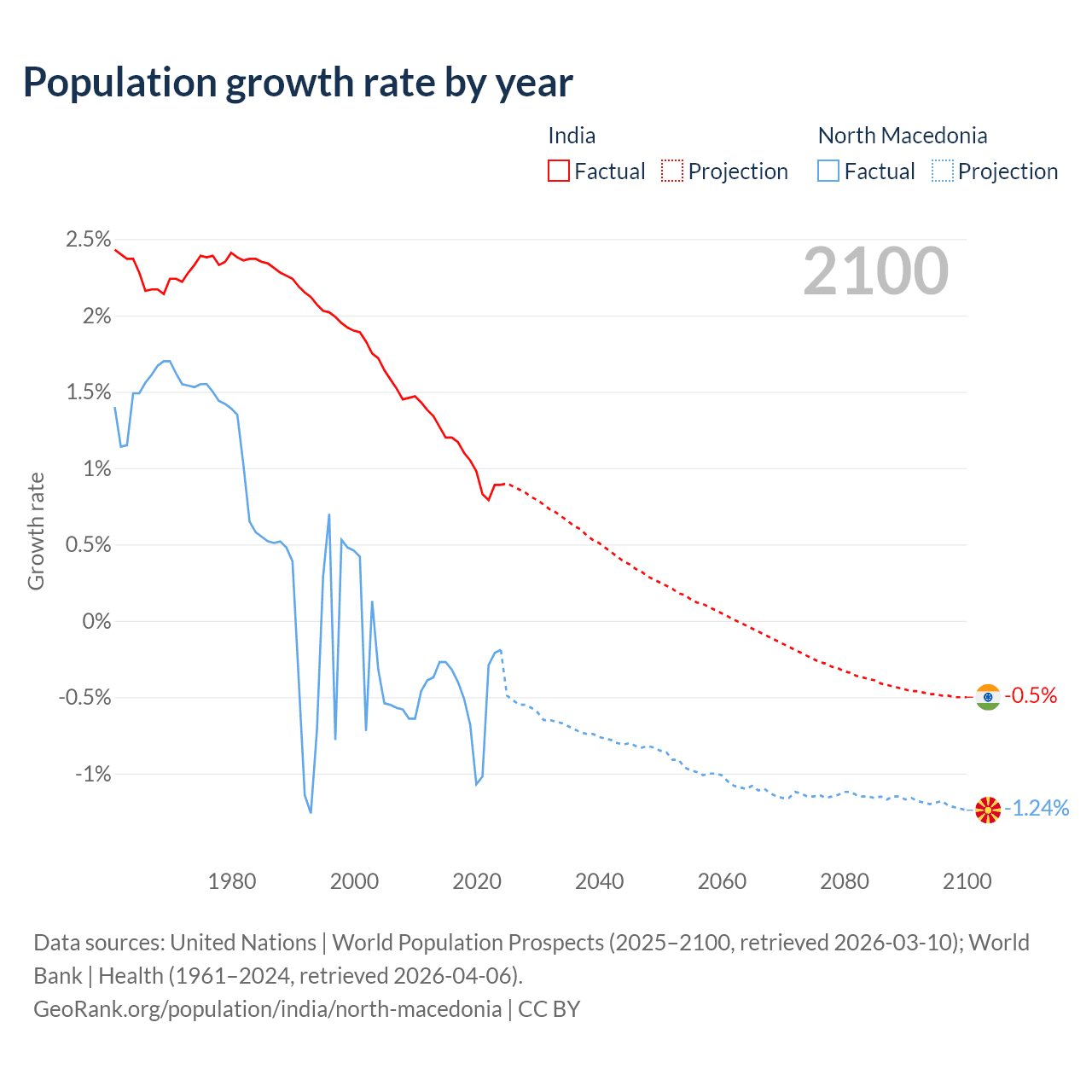 - For the last 10 years, India has had an average growth rate of +1.03% per year vs -0.48% in North Macedonia.