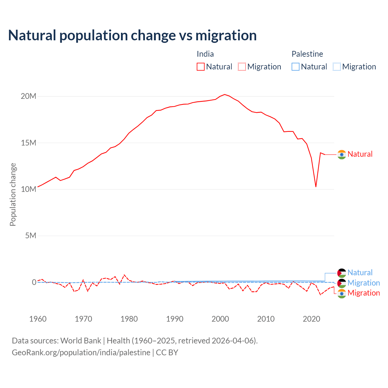 Over the last 10 years, 96.4% of the population change in India is from natural causes (a gain of 145,503,378 people) and 3.56% is from migration (a loss of 5,376,884 people). In Palestine 85.7% is from natural causes (a gain of 1,218,010 people) and 14.3% is from migration (a loss of 202,820 people).