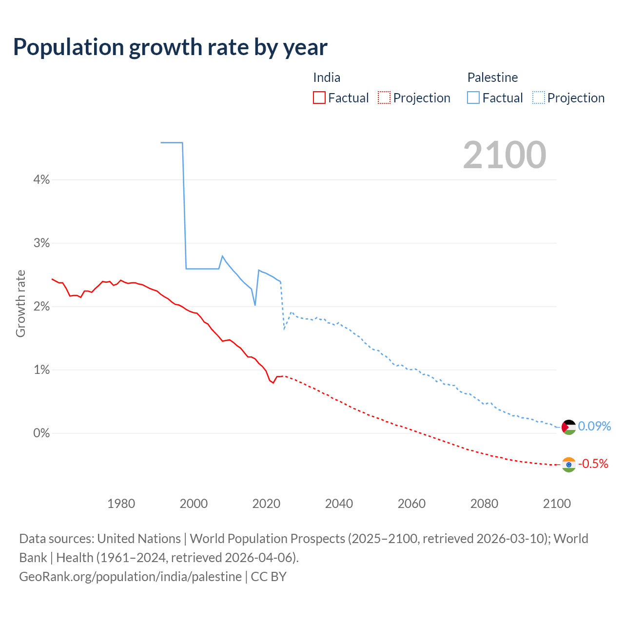 - For the last 10 years, India has had an average growth rate of +1.03% per year vs +2.4% in Palestine.