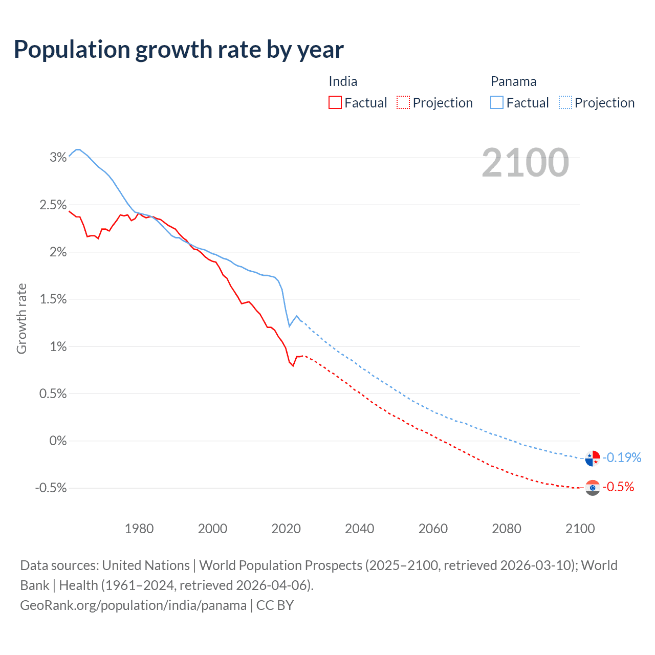 - For the last 10 years, India has had an average growth rate of +1.03% per year vs +1.52% in Panama.