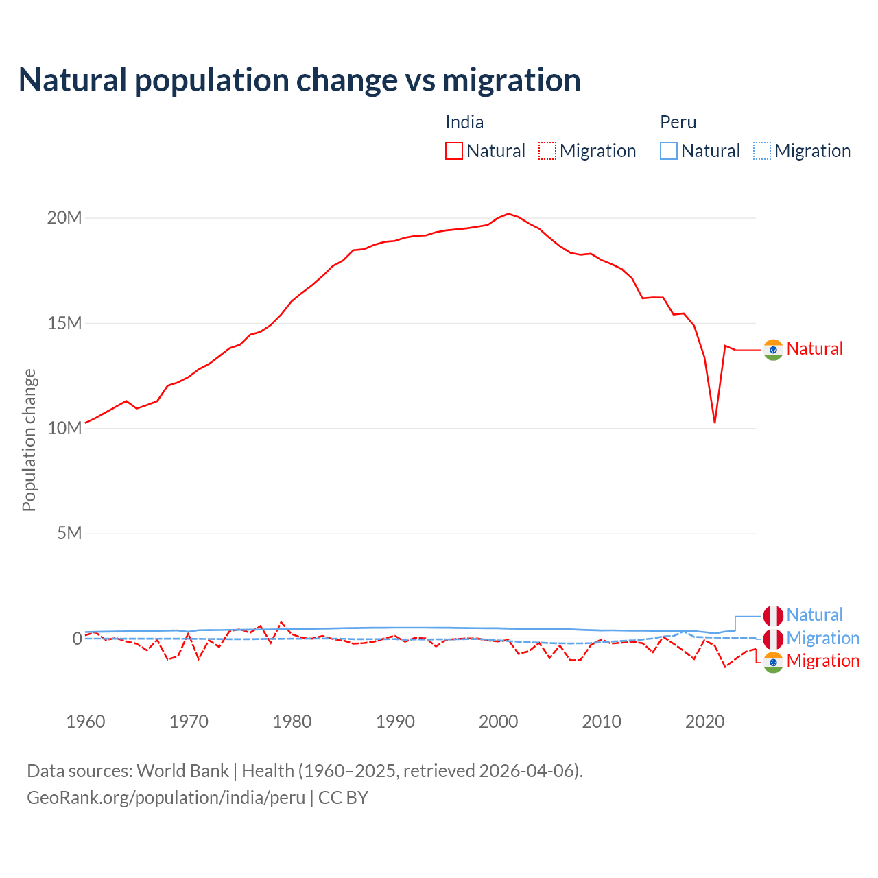 Over the last 10 years, 96.4% of the population change in India is from natural causes (a gain of 145,503,378 people) and 3.56% is from migration (a loss of 5,376,884 people). In Peru 82% is from natural causes (a gain of 3,345,822 people) and 18% is from migration (a gain of 732,505 people).