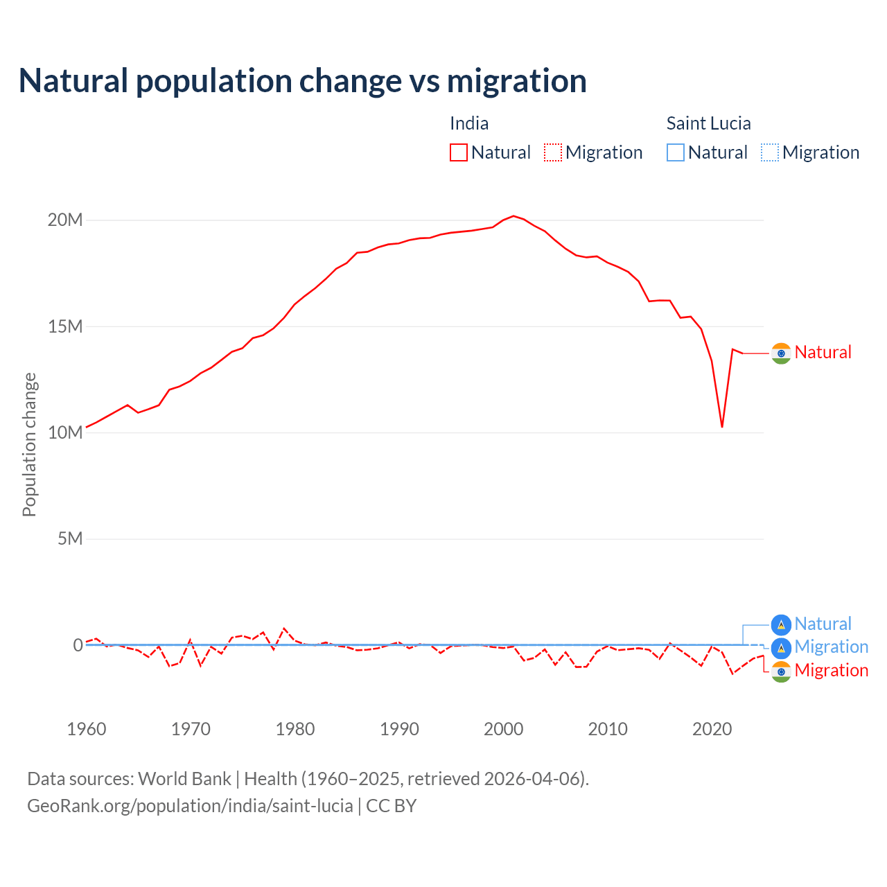Over the last 10 years, 96.4% of the population change in India is from natural causes (a gain of 145,503,378 people) and 3.56% is from migration (a loss of 5,376,884 people). In Saint Lucia 95.7% is from natural causes (a gain of 6,039 people) and 4.31% is from migration (a loss of 272 people).