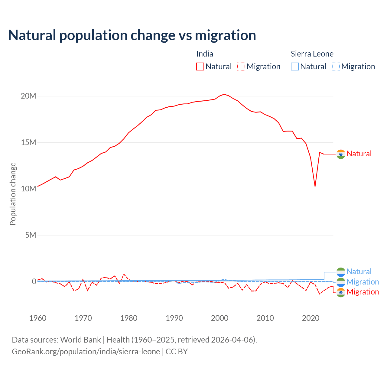 Over the last 10 years, 96.4% of the population change in India is from natural causes (a gain of 145,503,378 people) and 3.56% is from migration (a loss of 5,376,884 people). In Sierra Leone 99.6% is from natural causes (a gain of 1,764,049 people) and 0.41% is from migration (a loss of 7,211 people).