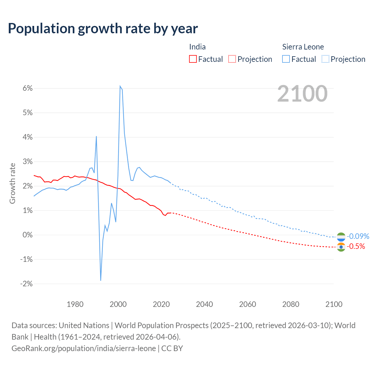 - For the last 10 years, India has had an average growth rate of +1.03% per year vs +2.32% in Sierra Leone.