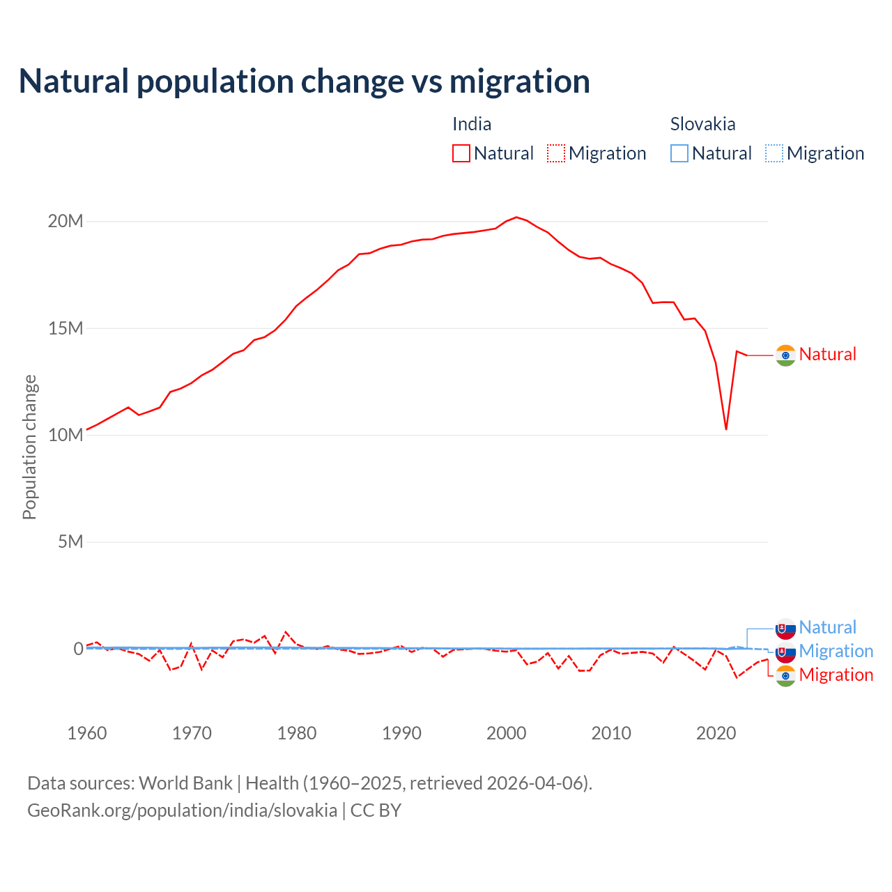 Over the last 10 years, 96.4% of the population change in India is from natural causes (a gain of 145,503,378 people) and 3.56% is from migration (a loss of 5,376,884 people). In Slovakia 7.47% is from natural causes (a loss of 8,728 people) and 92.5% is from migration (a gain of 108,156 people).