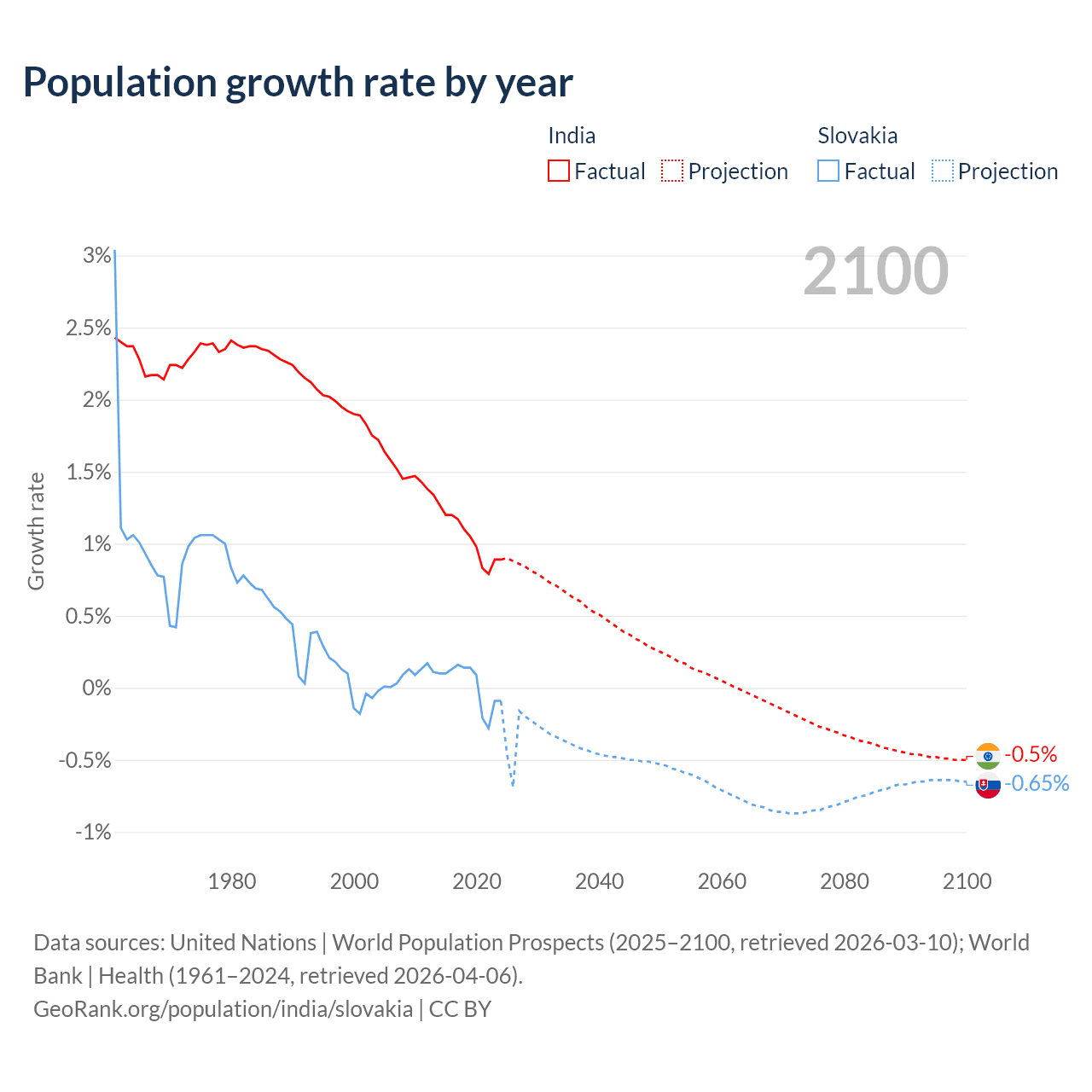 - For the last 10 years, India has had an average growth rate of +1.03% per year vs +0.01% in Slovakia.