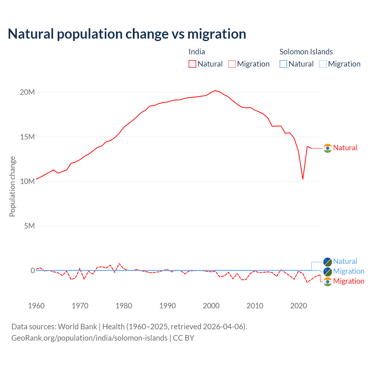 Over the last 10 years, 96.4% of the population change in India is from natural causes (a gain of 145,503,378 people) and 3.56% is from migration (a loss of 5,376,884 people). In the Solomon Islands 82.8% is from natural causes (a gain of 168,727 people) and 17.2% is from migration (a gain of 35,031 people).