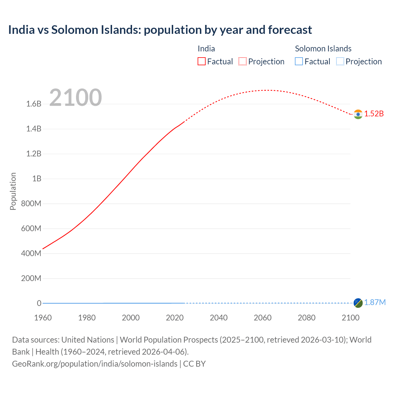 India vs Solomon Islands: population by year and forecast